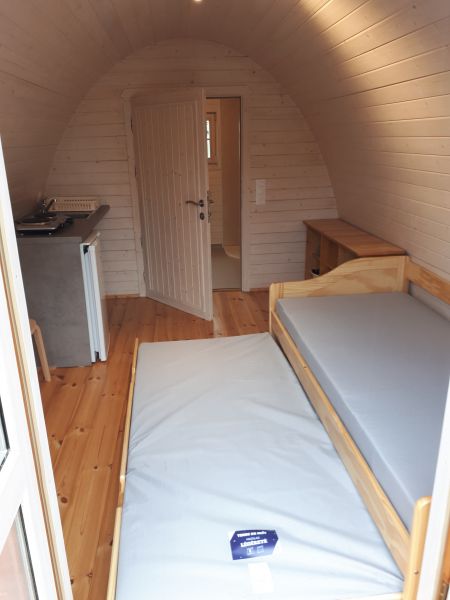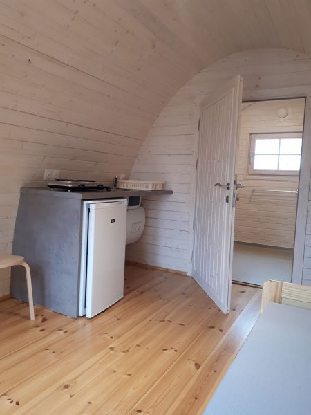 A living room with a pull-out bed (2x 90x190) that doubles as a sofa, duvets and pillows for 2 people (included), a dining area with a fold-away table (2 people) and 2 stools, a kitchen area with a small fridge, a hob, a sink with hot water, crockery and cooking utensils and shelves.