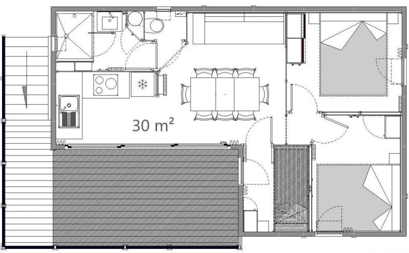 Une pièce de vie avec un canapé-lit convertible (140x190), TV, une clim réversible, un coin repas avec une table (8 personnes) et 8 chaises, un coin cuisine avec un réfrigérateur, un congélateur, une plaque de cuisson, une hotte, une bouilloire, un micro-onde, une cafetière (à filtres), un évier avec eau chaude, la vaisselle et les ustensiles de cuisine, des placards pour ranger les denrées alimentaires, de grandes baies vitrées coulissantes séparant la cuisine de la terrasse.